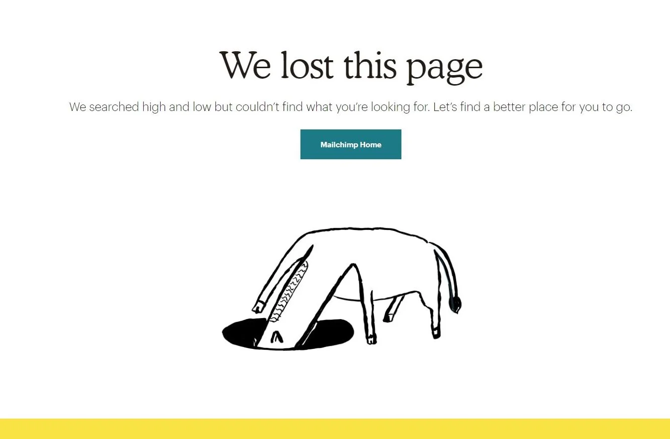 Mail Chimp 404 Error page: Clever messaging and illustration that works well with their brand - link to home page.