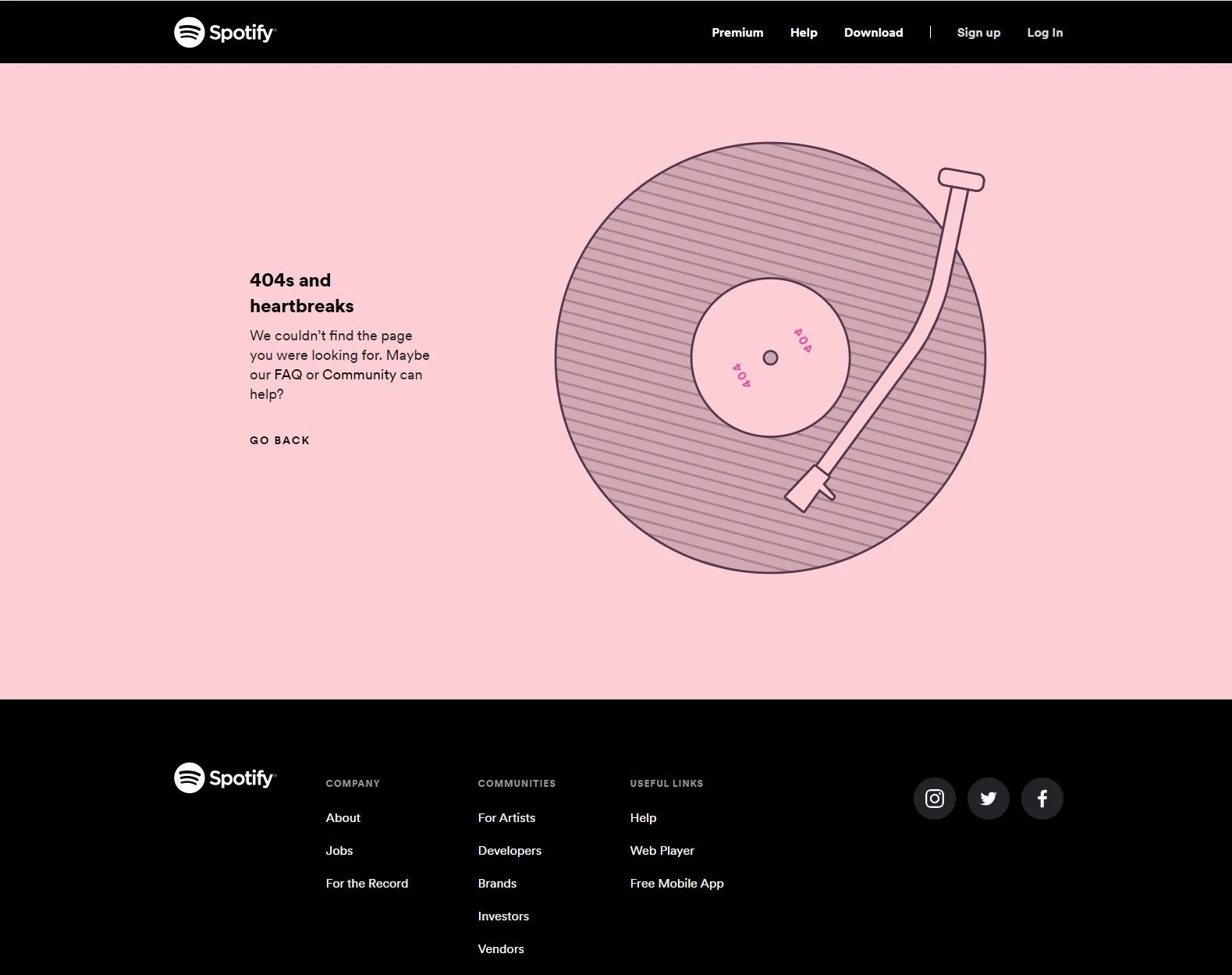 Spotify 404 error page: Clever play on words - a song title by Kanye West (808 and heartbreaks) and an old record - links to FAQ and community to help find information.