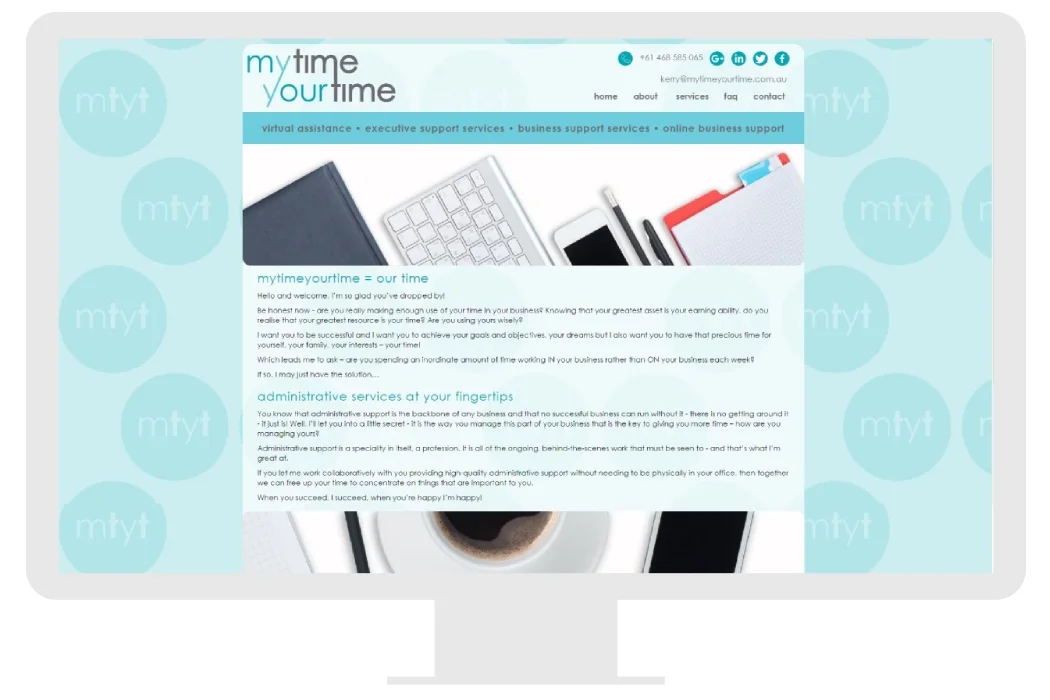 The website (developed in 2016) is a fully customised solution with specific design requirements for a background pattern. In collaboration with Blade Creative who designed the logo, we designed the banner and background that are part of the overall brand. The website provides information about services offered and how MTYT can help with a clear CTA.